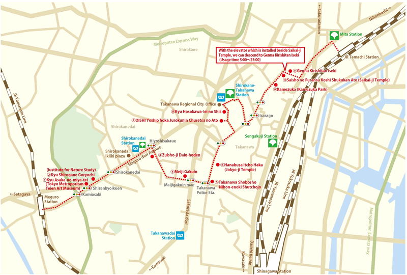 In this event of "Let's stroll around Shirokane-Takanawa", we start at Meguro Station, pass through Tokyo Metropolitan Teien Art Museum (former Residence of Asaka no Miya) and National Institute for Nature Study attached to The National Museum of Nature and Science (former Imperial Land in Shirogane) which had been the suburban residence of MATSUDAIRA Sanuki-no-kami (Lord of Takamatsu domain, current Kagawa prefecture) in the Edo period, turn right around Zuisho-ji Temple and arrive at Meiji Gakuin. Then we go up a hill, we will see Takanawa Fire Station Nihon-enoki Branch Office. Furthermore, when we take Nawatemichi Street toward Isarago, there appear former Kumamoto domain Hosokawa Family's suburban residence and Toki Family's second residence (Kamezuka) and Saikai-ji Temple (the first French Legation). Along the Tokaido Highway lining the seashore, there are Tozen-ji Temple, Sengaku-ji Temple and the site of Christians in Genna era. Finally going up further north on Tokaido Highway, Nawatemichi Street, we can find many historic sites around this Mita area.