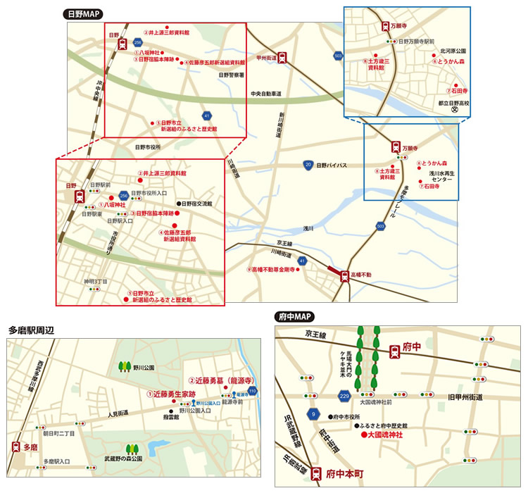 日野市を始めとした多摩地域は、新選組隊士たちの息づかいが伝わる資料や、ゆかりの場所が多く残る、新選組のふるさとです。